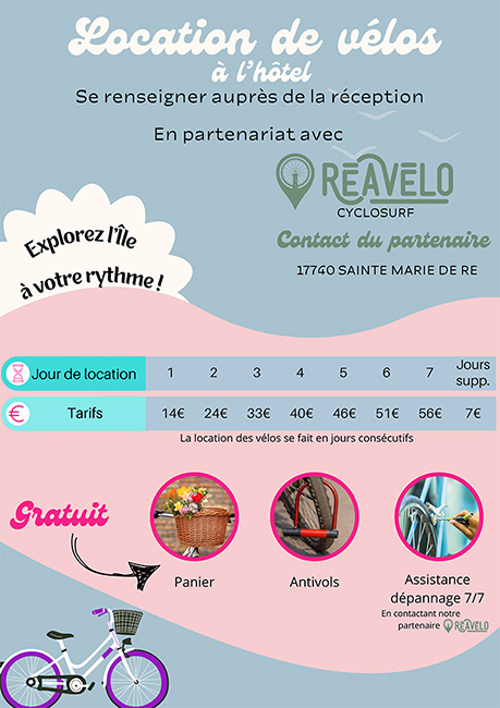 Locations de vélo sur place ou directement chez notre partenaire situé à 10mn à pieds : http://www.reavelo.fr/